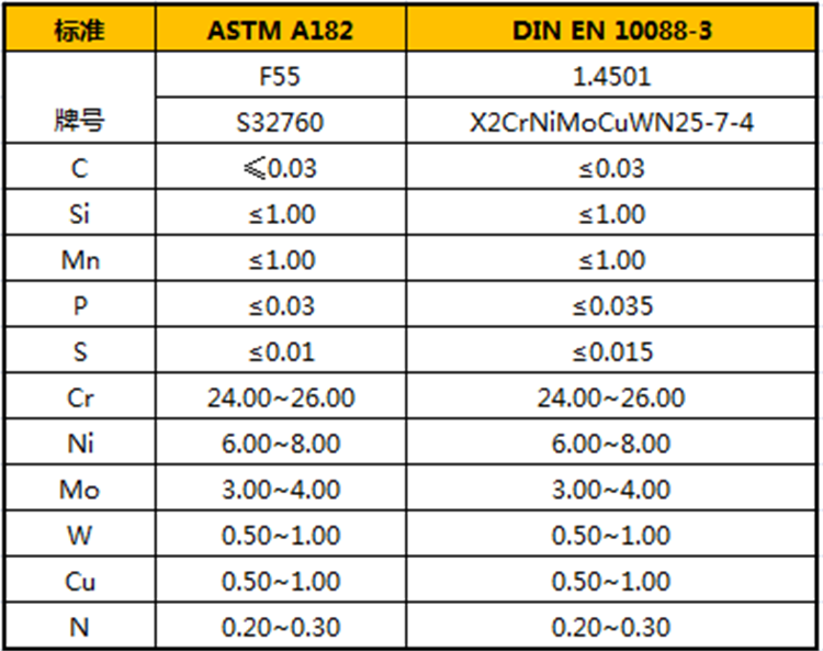 F55相近牌號為022Cr25Ni7Mo4WCuN(國標)和1.4501(德標)。國標成分和美標完全一致。